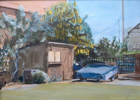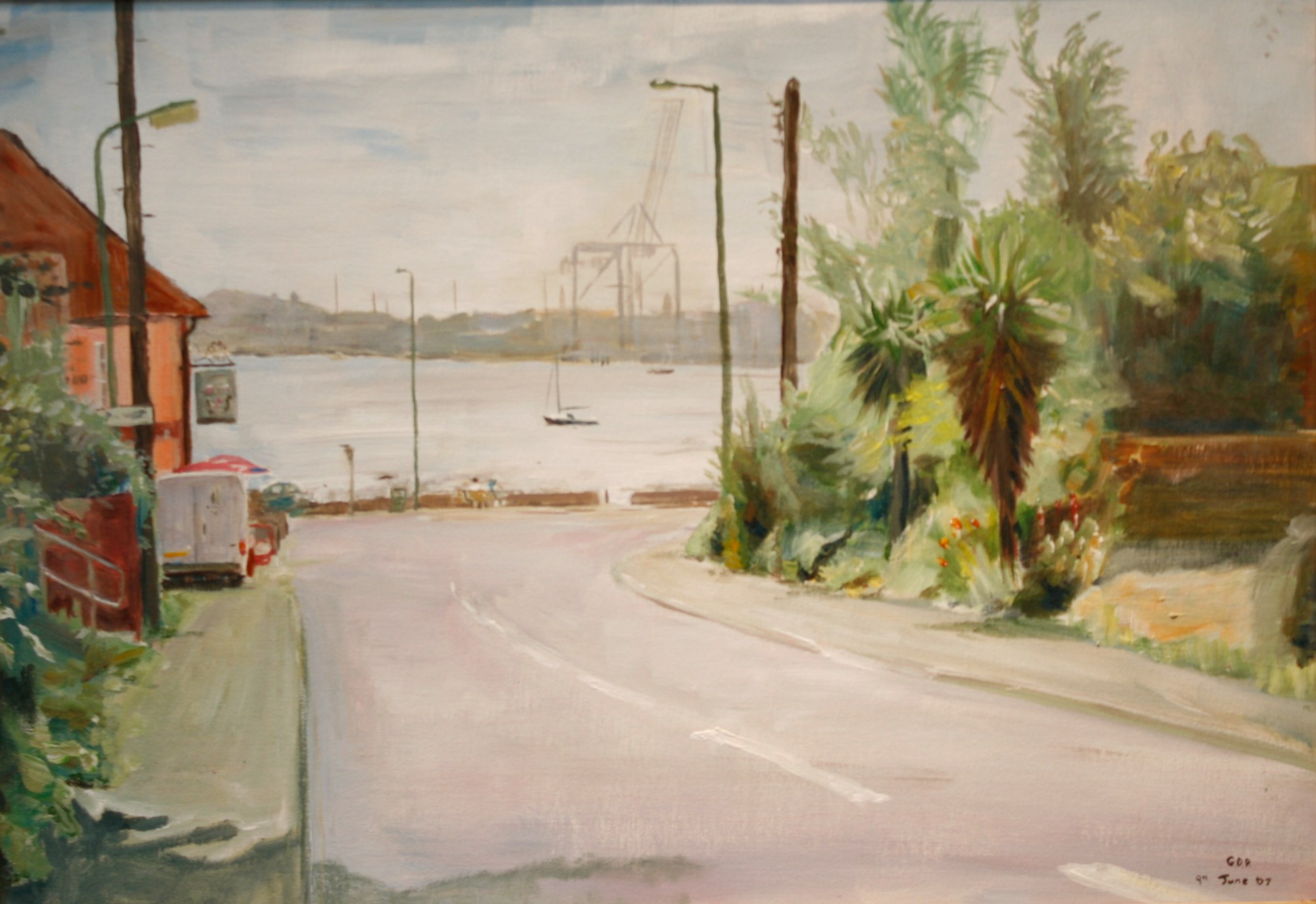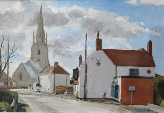 A study of the view past the 'Bristol Arms' pub in Shotley painted 'en plein air' in acrylics on canvas board 66cm x 49cm.