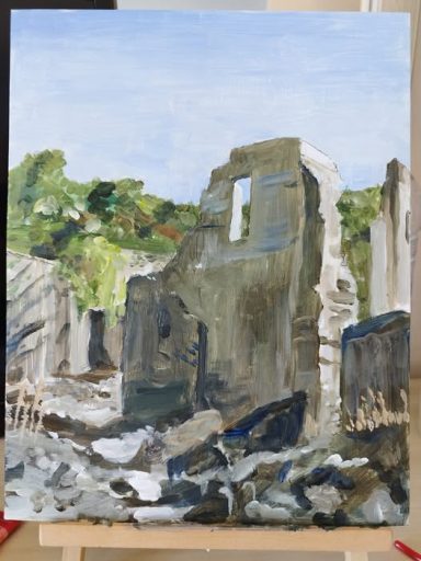 A study in acrylics on canvas paper from direct observation in the Ghost Town of Fethiye in Southwestern Turkey. 36cm x 28cm.