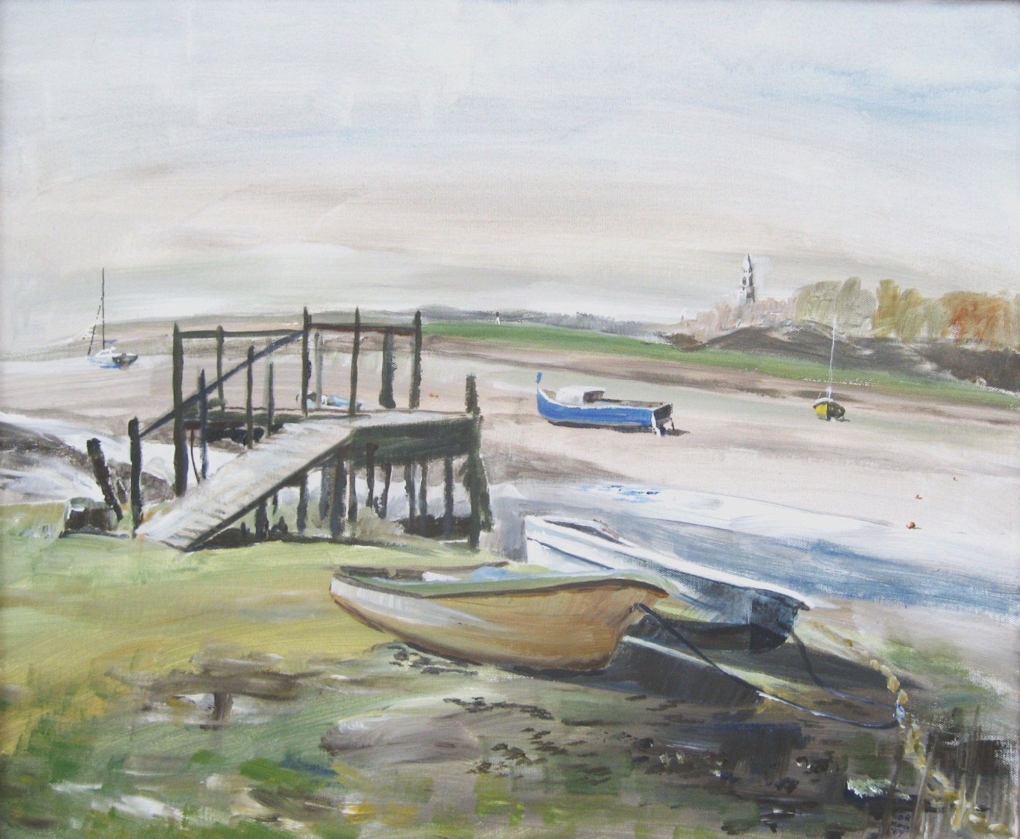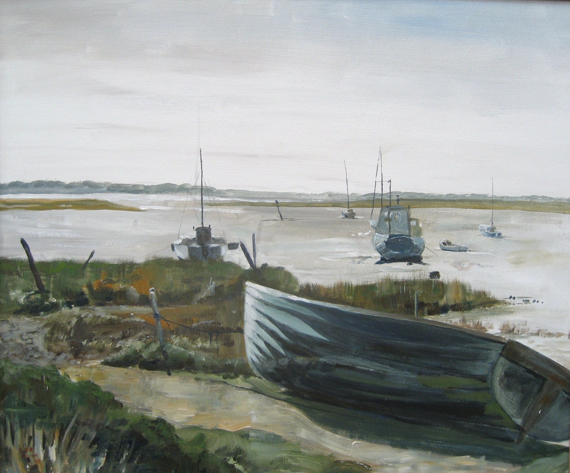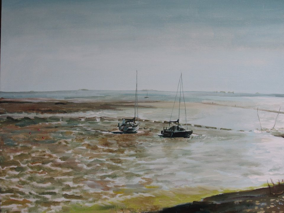 Acrylic study of a view from the sea wall near Holbrook Creek on canvas board in a wooden frame 59cm x 49cm