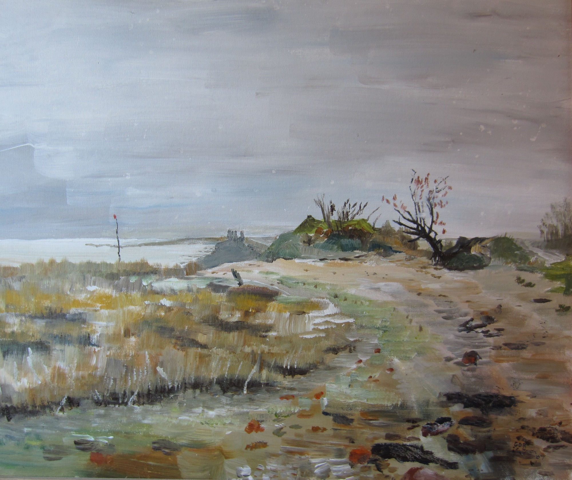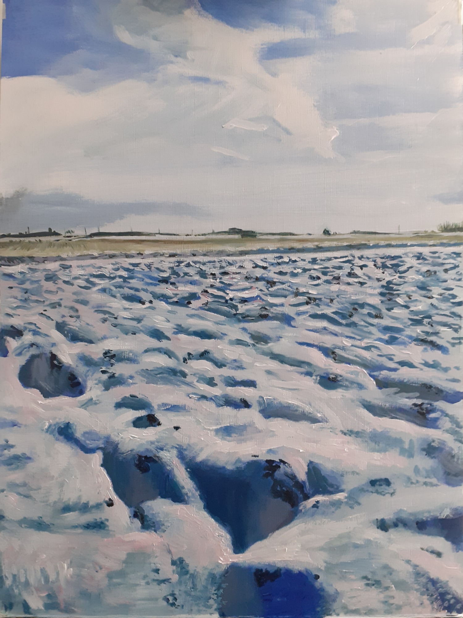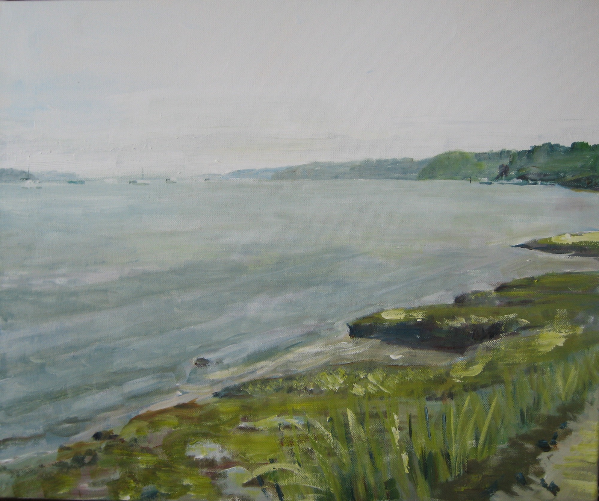 Acrylic study of a view from the sea wall near Holbrook Creek on canvas board in a wooden frame 59cm x 49cm