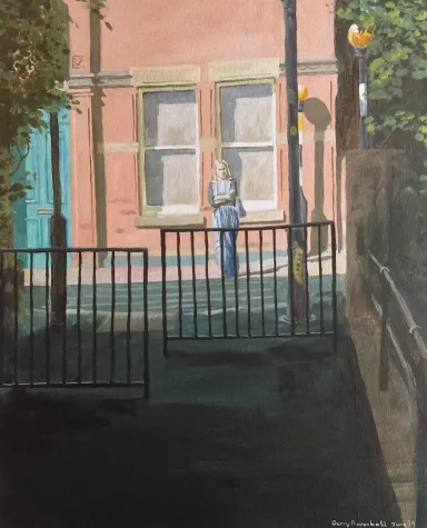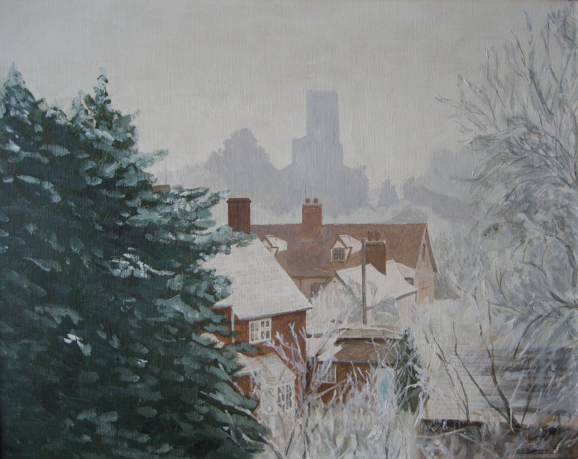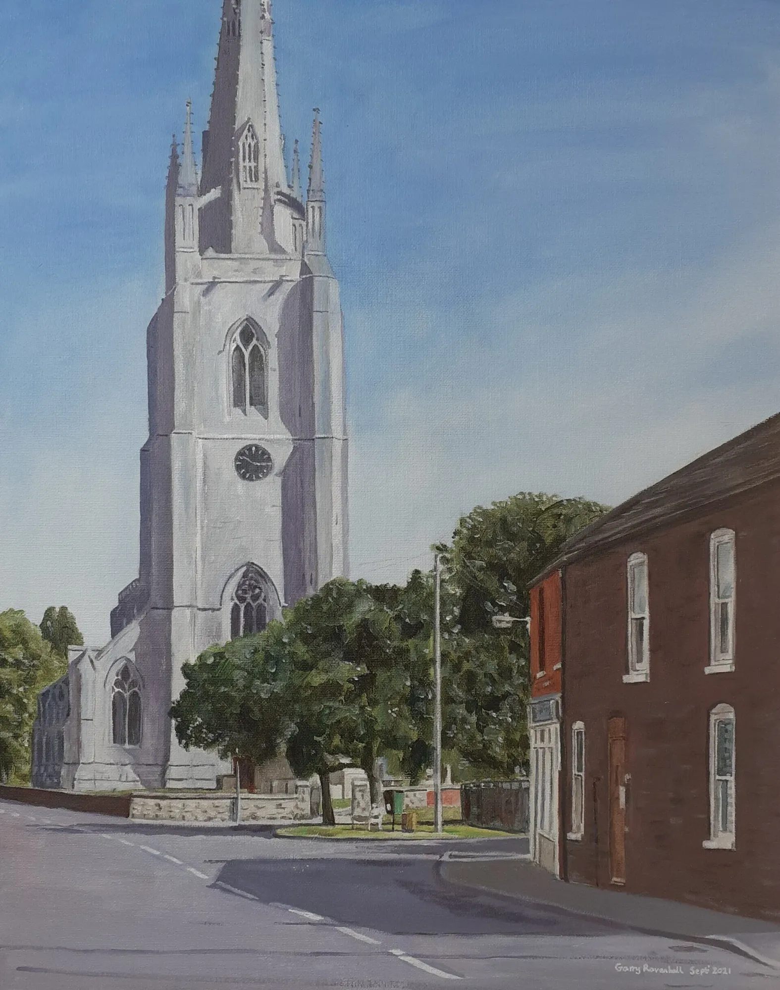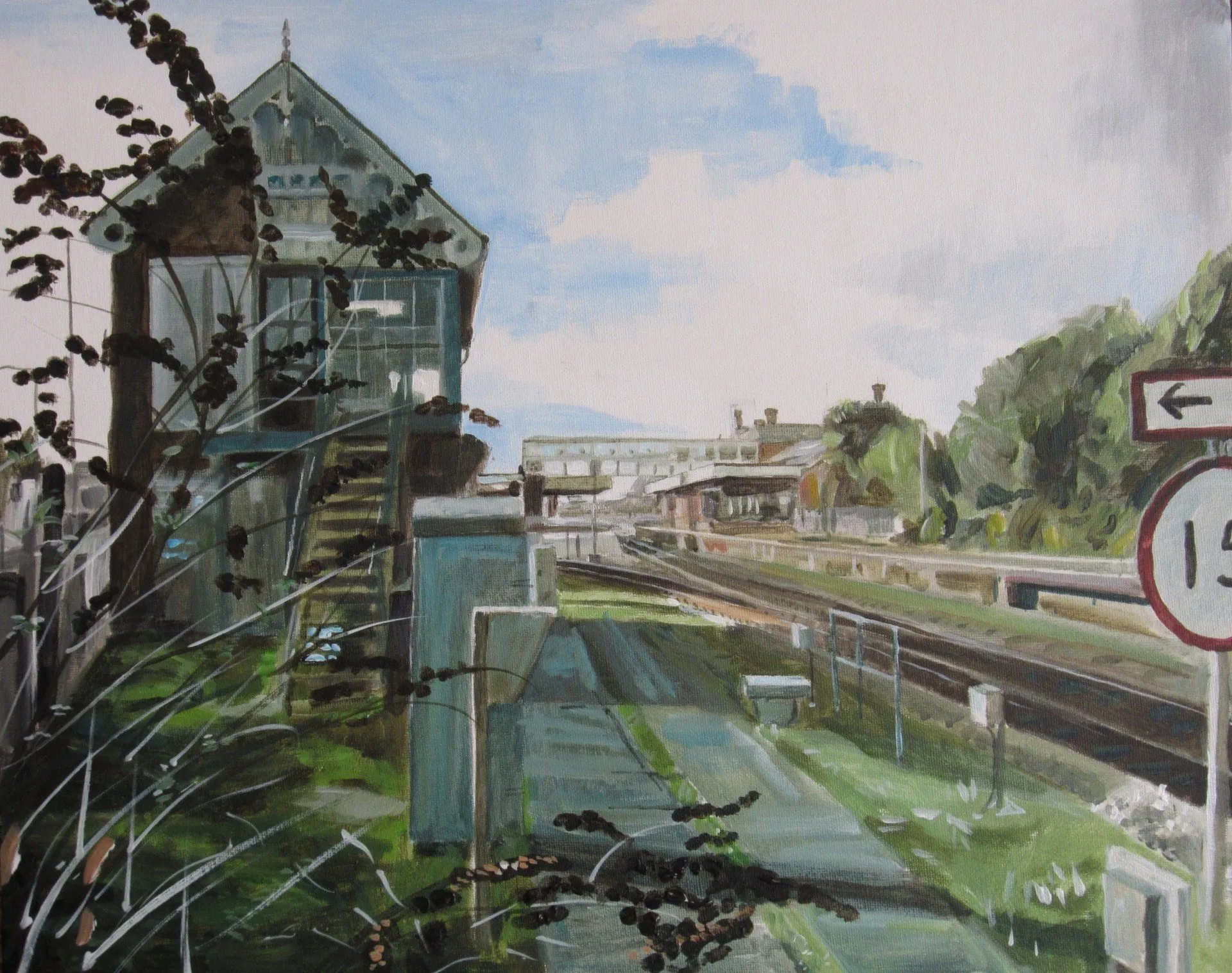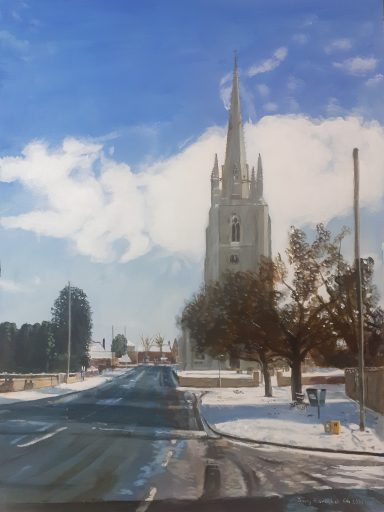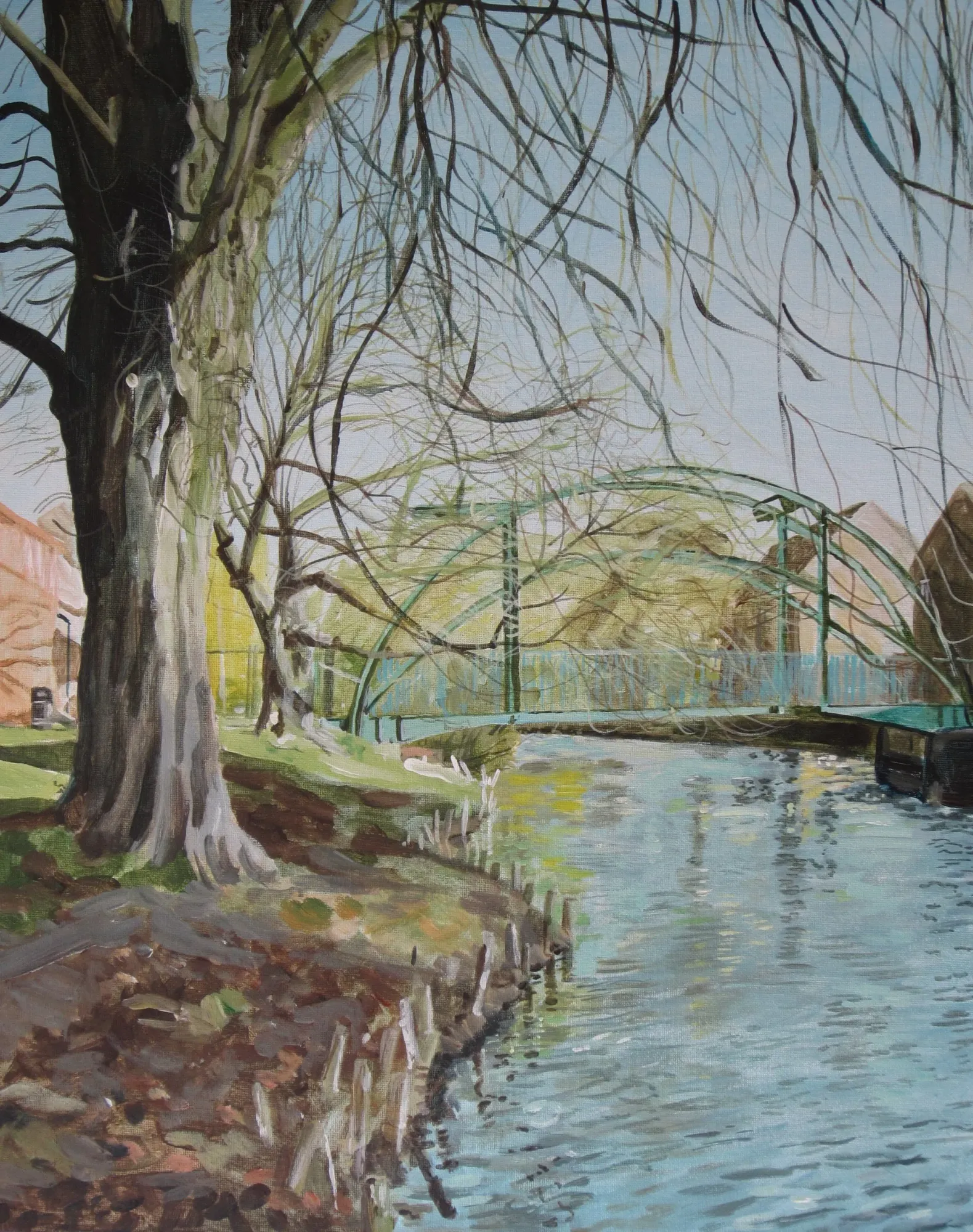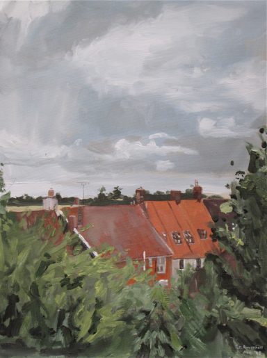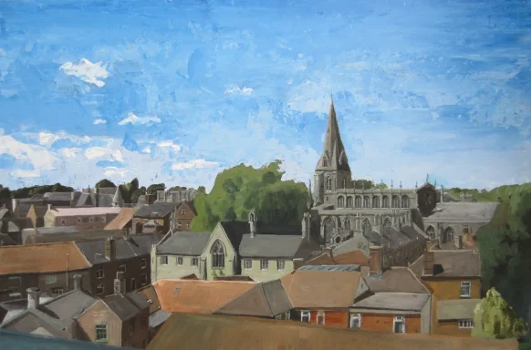 Acrylics on canvas board - 20" x 16". Study looking onto Carre Street in Sleaford from the river. Partly literal and partly symbolic.
