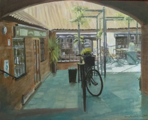 Acrylic painting of the courtyard outside Millers Restaurant in Sleaford, Lincolnshire. 2019 on canvas board.