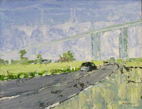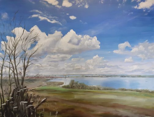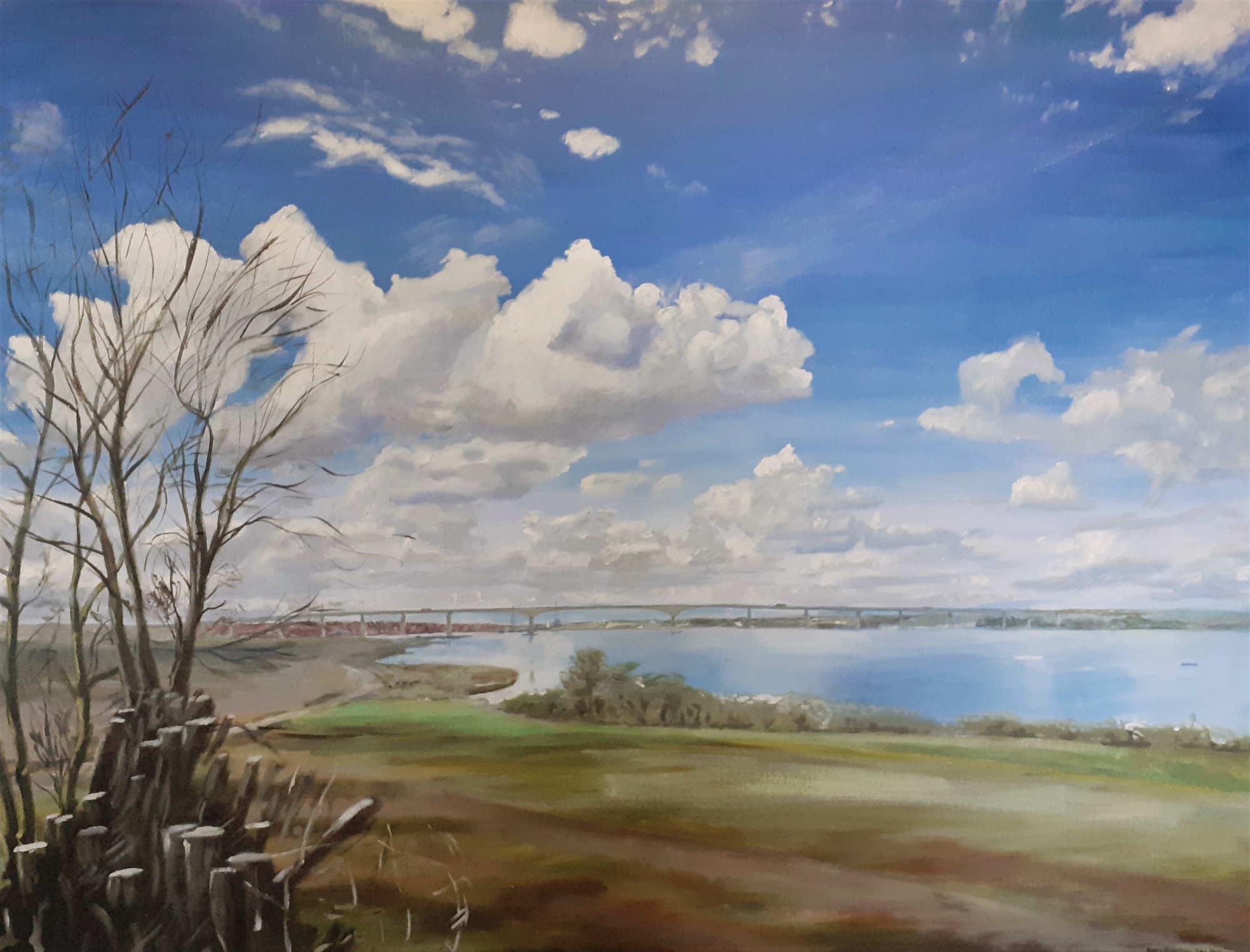 Large acrylic painting looking towards the Orwell Bridge near Ipswich from the direction of Freston.