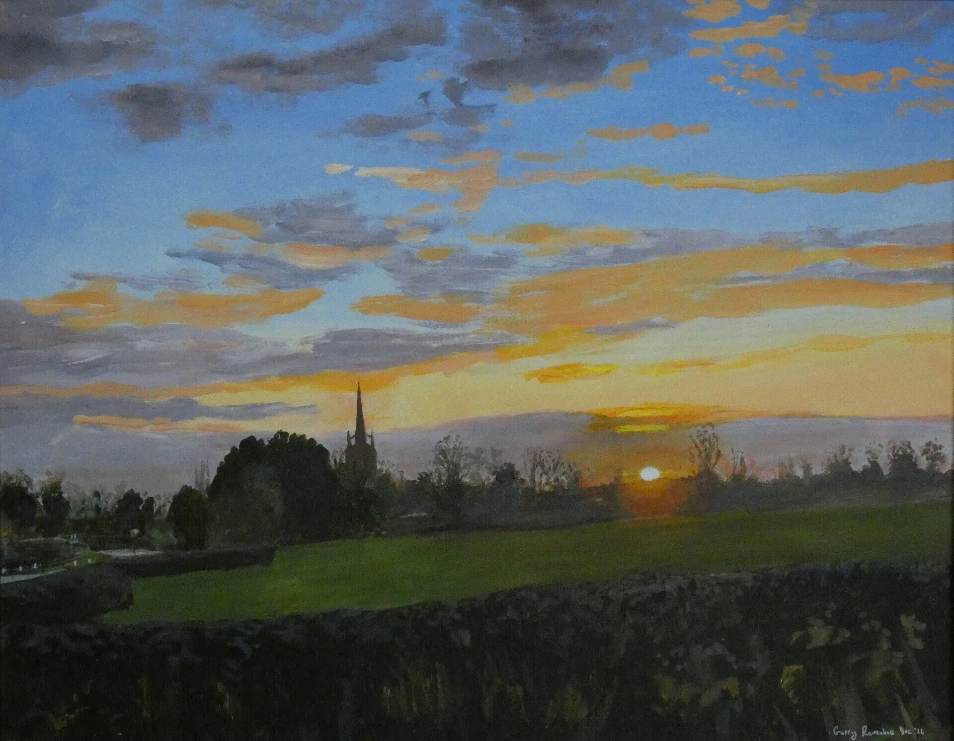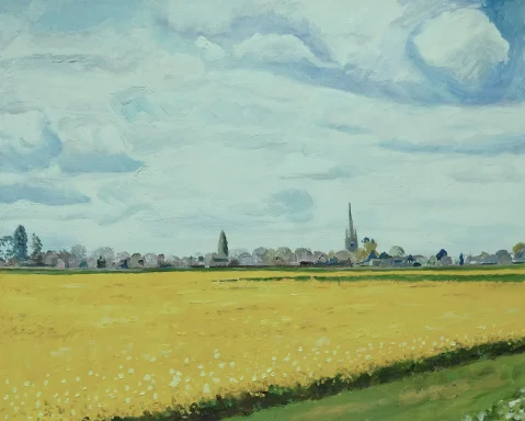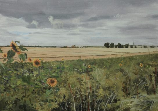 An acrylic study of the fen to the east of Helpringham village looking across the landscape past an area of sunflowers.