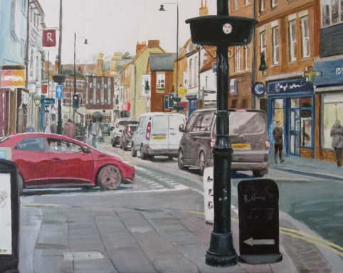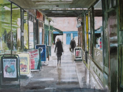 This is an acrylic study 16" x 12" showing a view southwards through the Bristol Arcade in Sleaford. Painted in acrylics on canvas board.