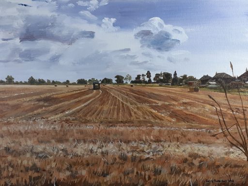 Acrylic painting of harvest time in the last summer of 2022. Painted on canvas board and supplied in a gold-effect frame. (46cm x 36cm appro