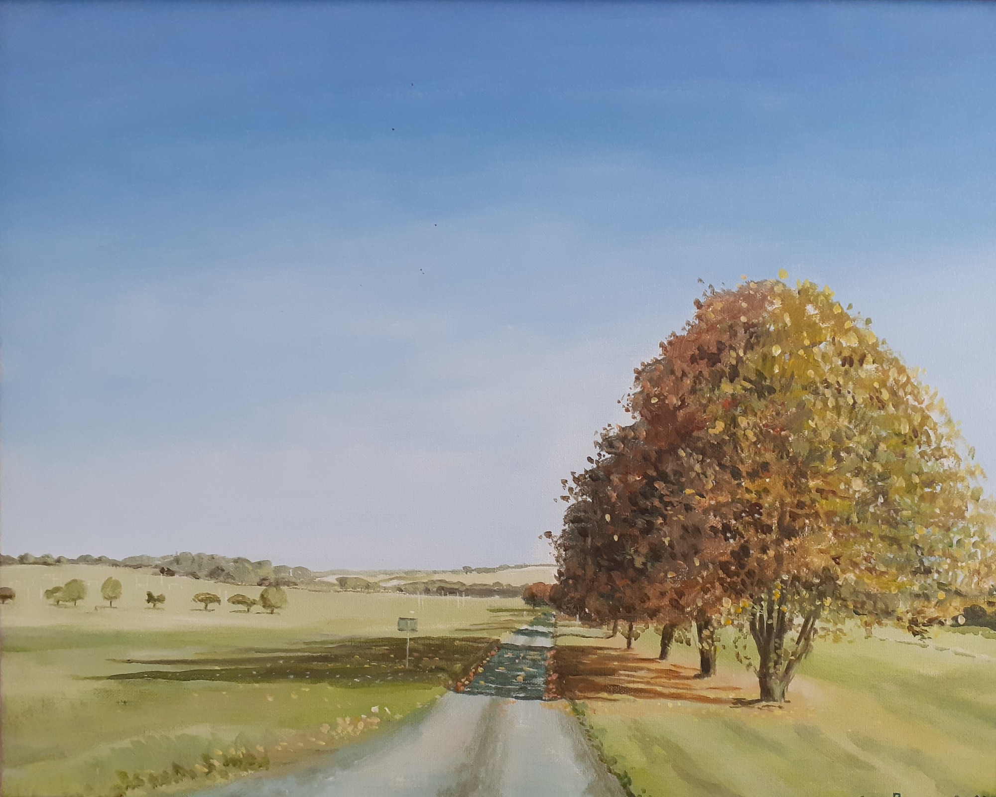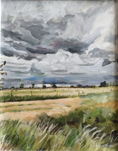 Acrylic painting in glass-lined simple, white box frame, showing a scene from the Burton Road, near Helpringham on a stormy summer's day.