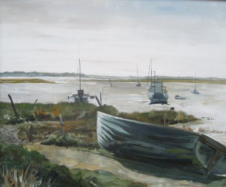 An 'en plein air' study of a blue rowing boat at Holbrook Creek, painted in acrylics on canvas board.